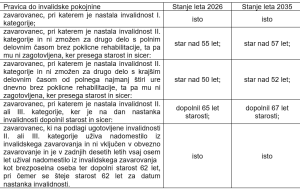 - delo s krajšim delovnim časom: osebe z invalidnostjo III. kategorije, ki niso več zmožne delati s polnim delovnim časom, ter osebe z II. kategorijo invalidnosti bodo morale po novem dopolniti vsaj 57 let (namesto 55), da bodo upravičene do te pravice.