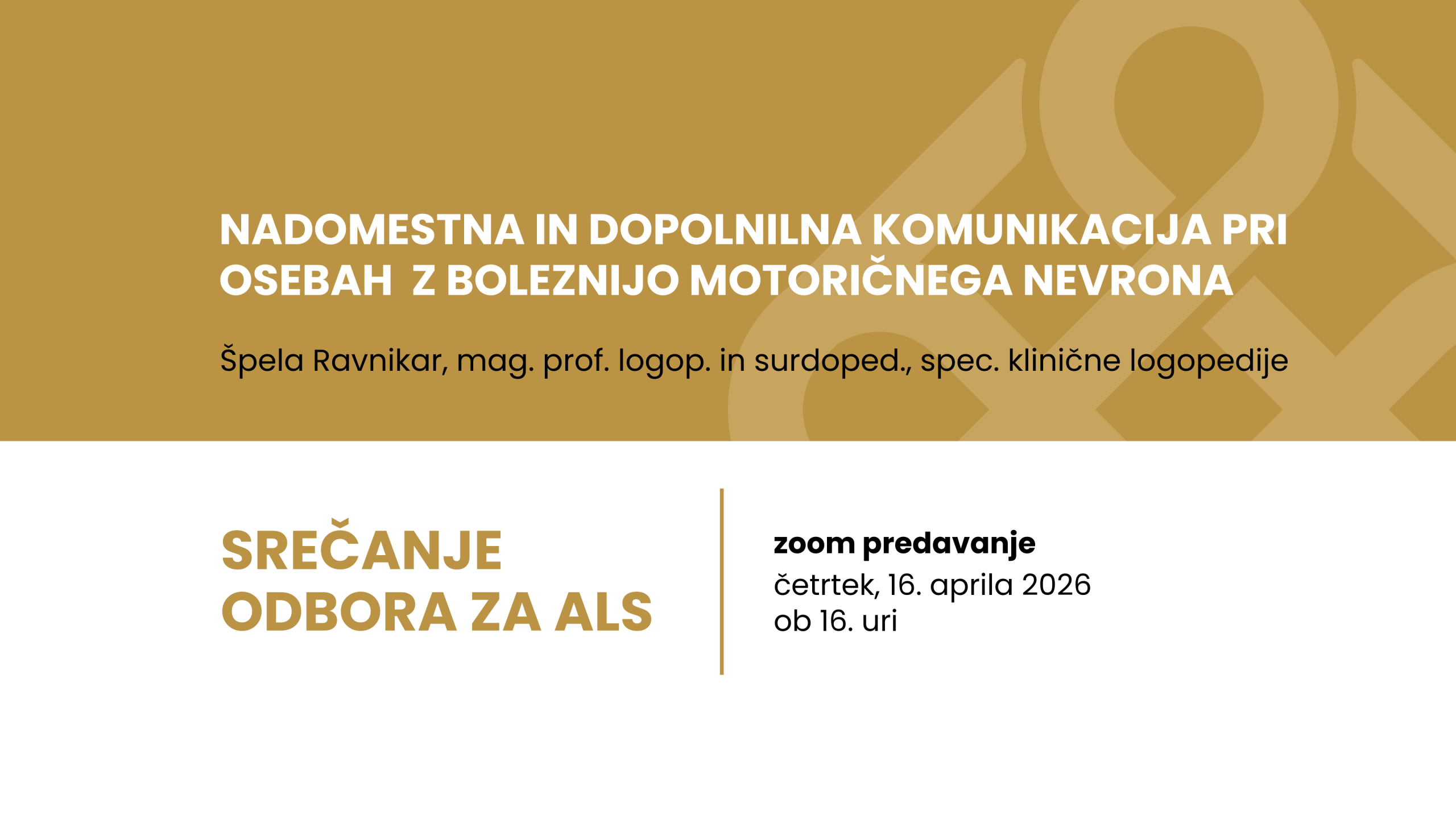V okviru rednega mesečnega srečanja Odbora za ALS vas v četrtek, 16. aprila 2026, ob 16. uri, vabimo na brezplačno zoom predavanje Špele Ravnikar, mag. prof. logop. in surdoped., specialistke klinične logopedije, z naslovom